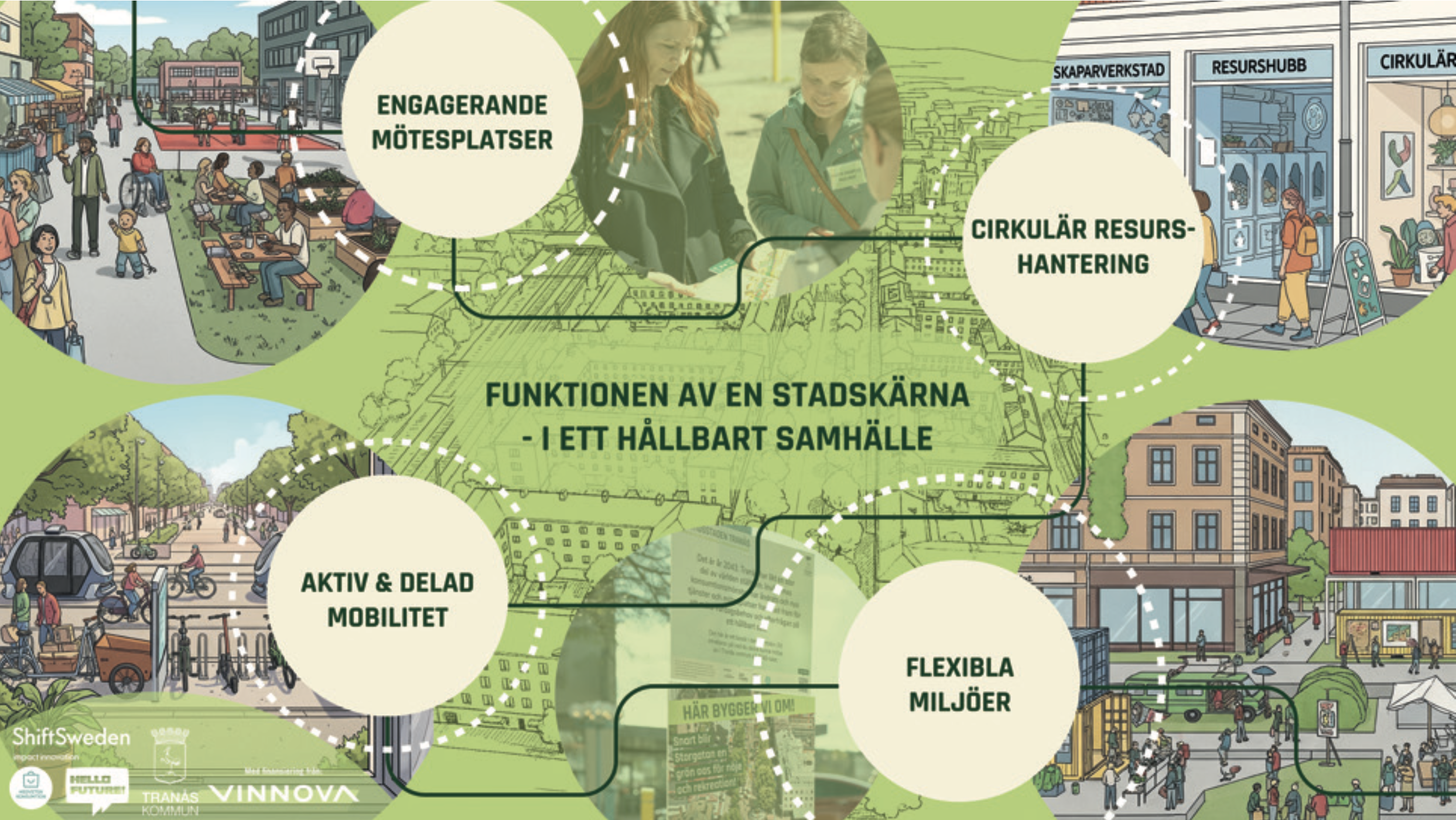 Illustrationen visar en generell framtidsbild, framtagen inom innovationsprojektet ”Funktionen av en stadskärna”, som fungerat som inspiration i arbetet med stadsvisionen.